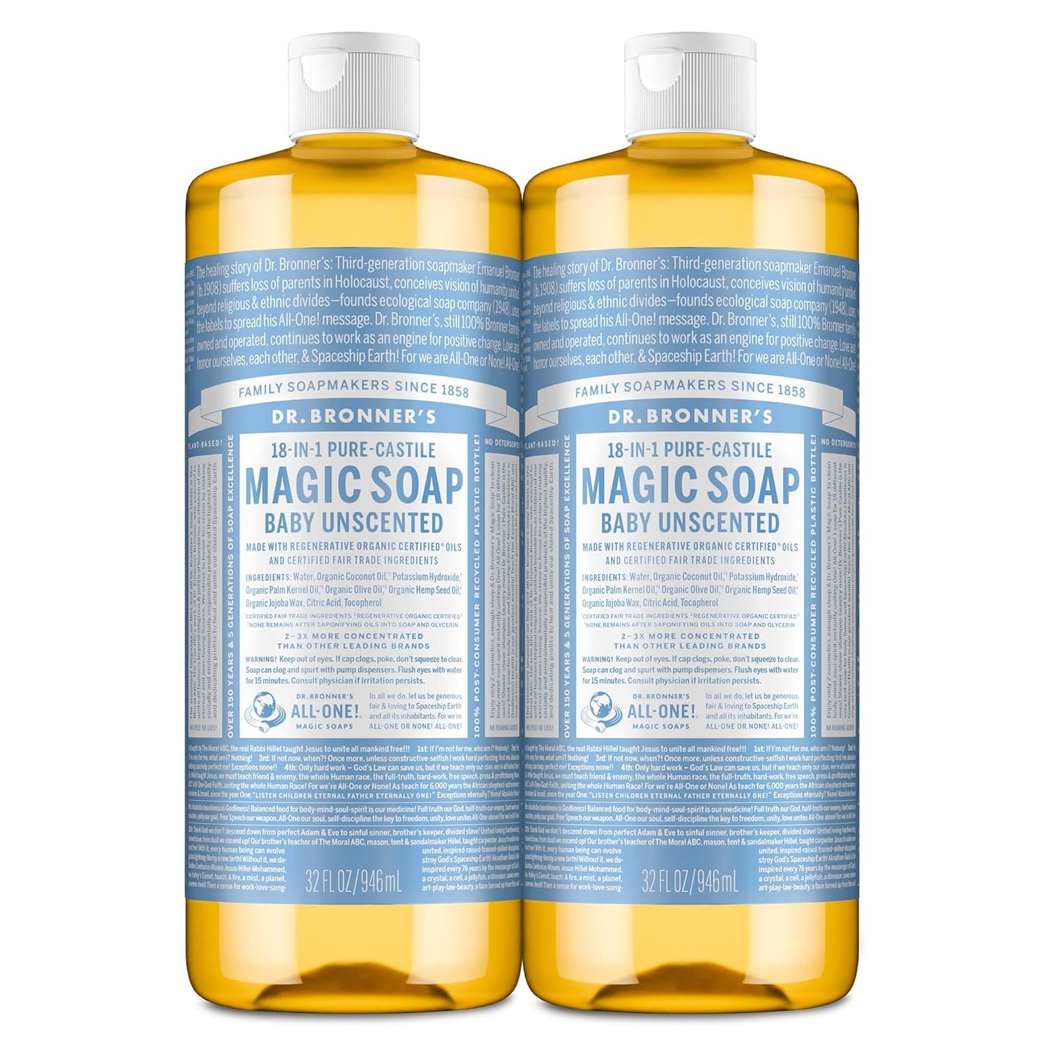 Dr. Bronner's Magic Soap-Pure-Castile Liquid Soap (Baby Unscented, 32 ounce, 2-Pack)-Regenerative Organic Certified Oils, 18-in-1 Uses: Body, Laundry & Dishes, For Sensitive Skin, No Fragrance