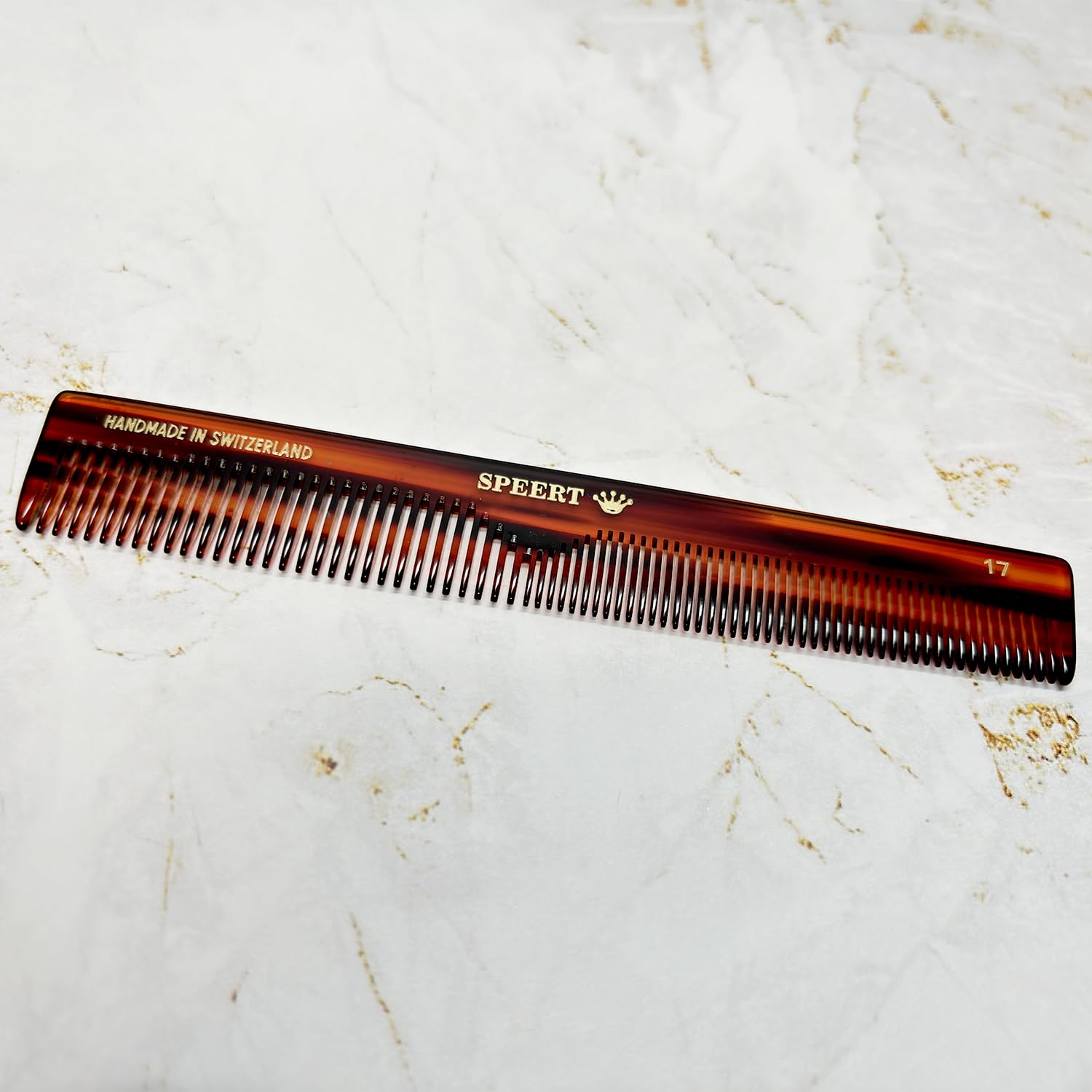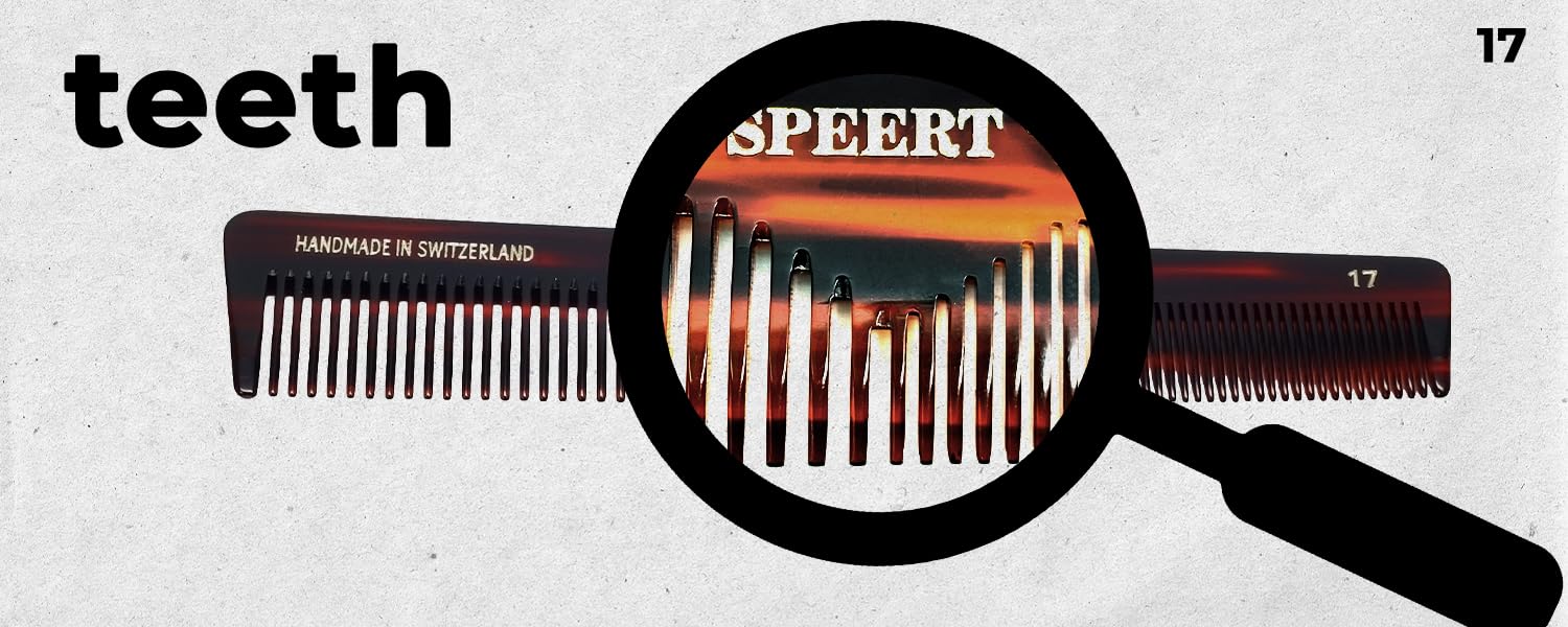 - Swiss Craftsmanship: Handcrafted in Switzerland, our Speert European comb is a masterpiece of design and functionality, constructed from premium cellulose acetate for unparalleled durability and flexibility. This carefully selected material ensures a smooth, seamless glide through all types of facial hair, providing a grooming experience free from static or snags. This comb respects the skin and scalp, promoting a healthy grooming routine. Measures: 6.34" x 1.02" x 0.12" (161 x 26 x 3 MM)
