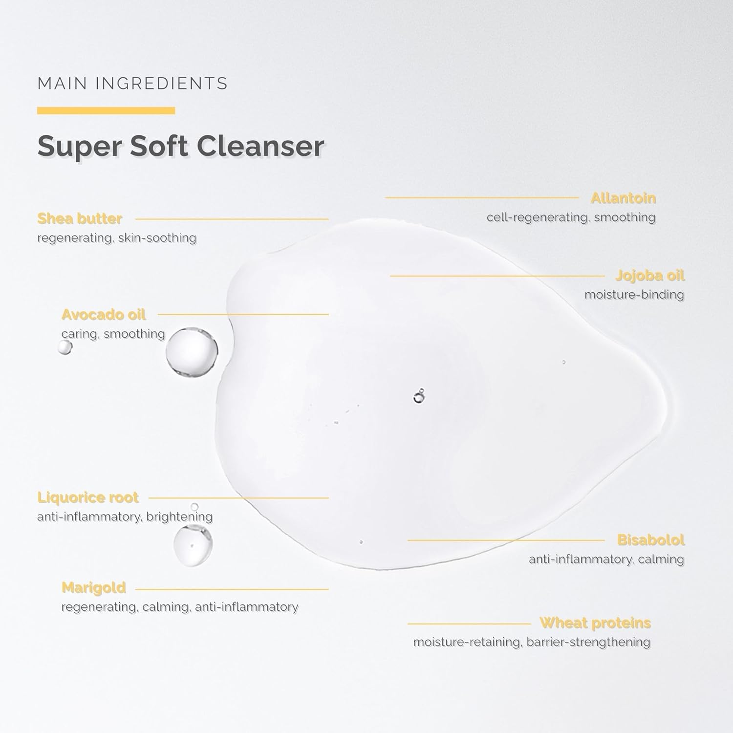- CONVINCING: The Super Soft Cleanser is characterized by its smooth cleansing effect without drying out the skin. In addition, it gently and thoroughly removes make up. The Cleanser is produced without parabens, mineral oil, silicones and colorants.