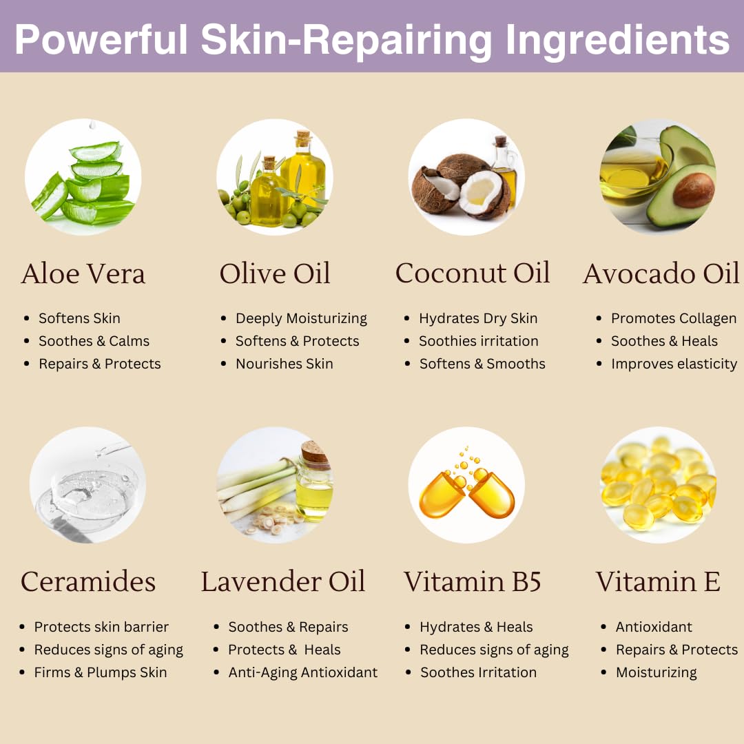 - Repairs Skin Barrier and Smooths Crepey Texture – Infused with ceramides, vitamin B5, and vitamin E to strengthen skin’s protective barrier, improve elasticity, and soften rough patches. Ideal hand and body cream for aging skin, dry cracked elbows, and legs.