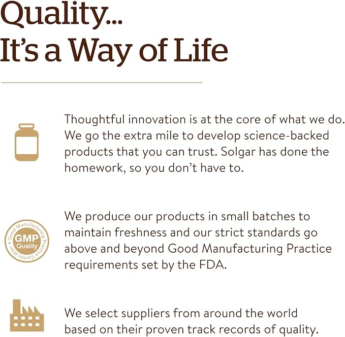 - The Gold Standard: For over 70 years, Solgar has been committed to quality, health, and well-being. Our mission is to create the finest nutritional supplements in small batches, through tireless research, using only the finest raw materials
