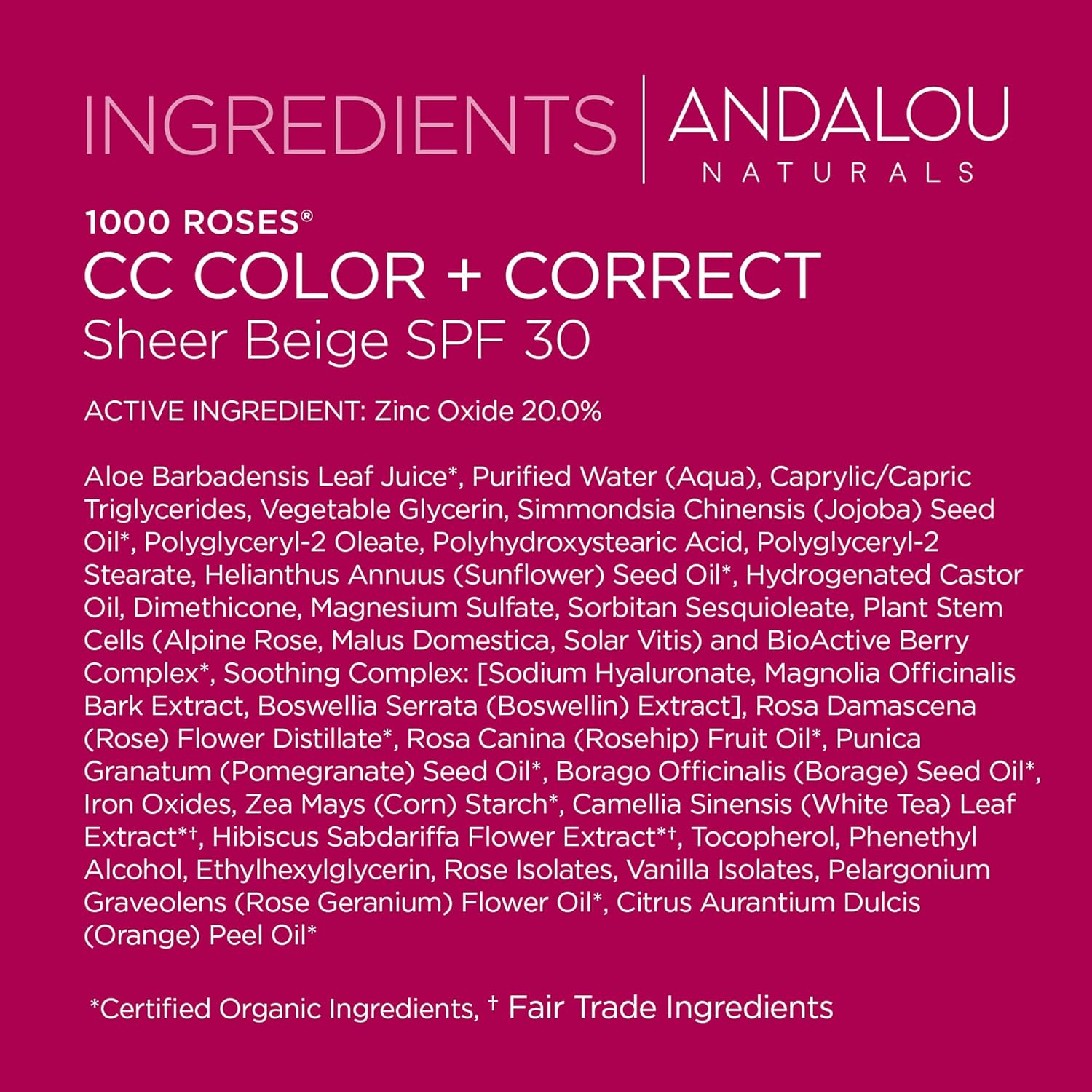 Andalou Naturals 1000 Roses CC Color + Correct with SPF 30, Sheer Beige, 2-in-1 Face Sunscreen + CC Cream for Sensitive Skin, Helps Correct Uneven Skin Tone, Reef Safe Sunscreen, 2 Fl Oz