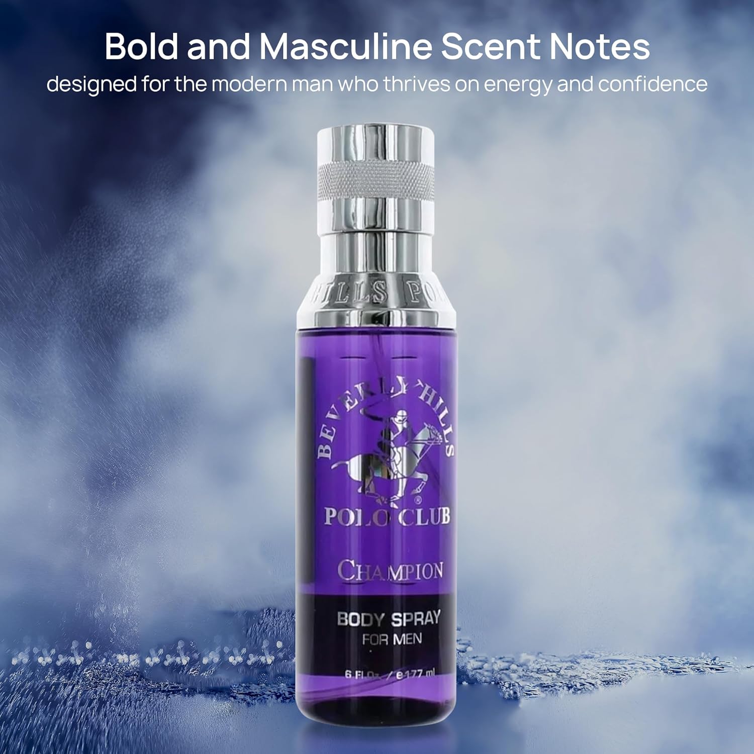 Beverly Hills Polo Club Body Spray for Men - BHPC Champion - Notes of Vanilla, Lily, Oakmoss & Patchouli - Long Lasting Body Mist Cologne Scent - Ideal Gift for Him, 6oz