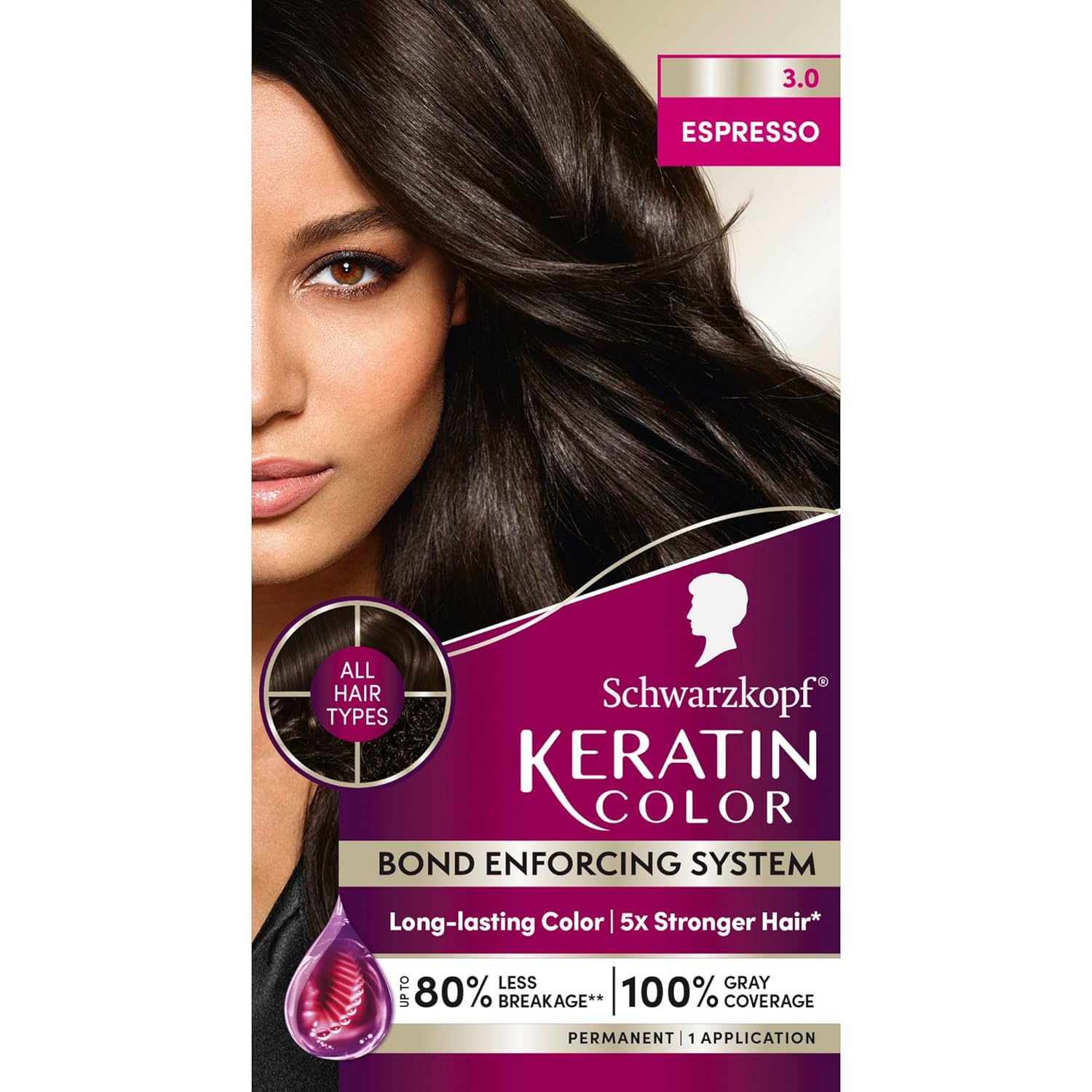 Schwarzkopf Keratin Permanent Hair Dye Cream, 3.0 Espresso, Professional Quality Color for Up to 100% Gray Coverage, Bond Enforcing System