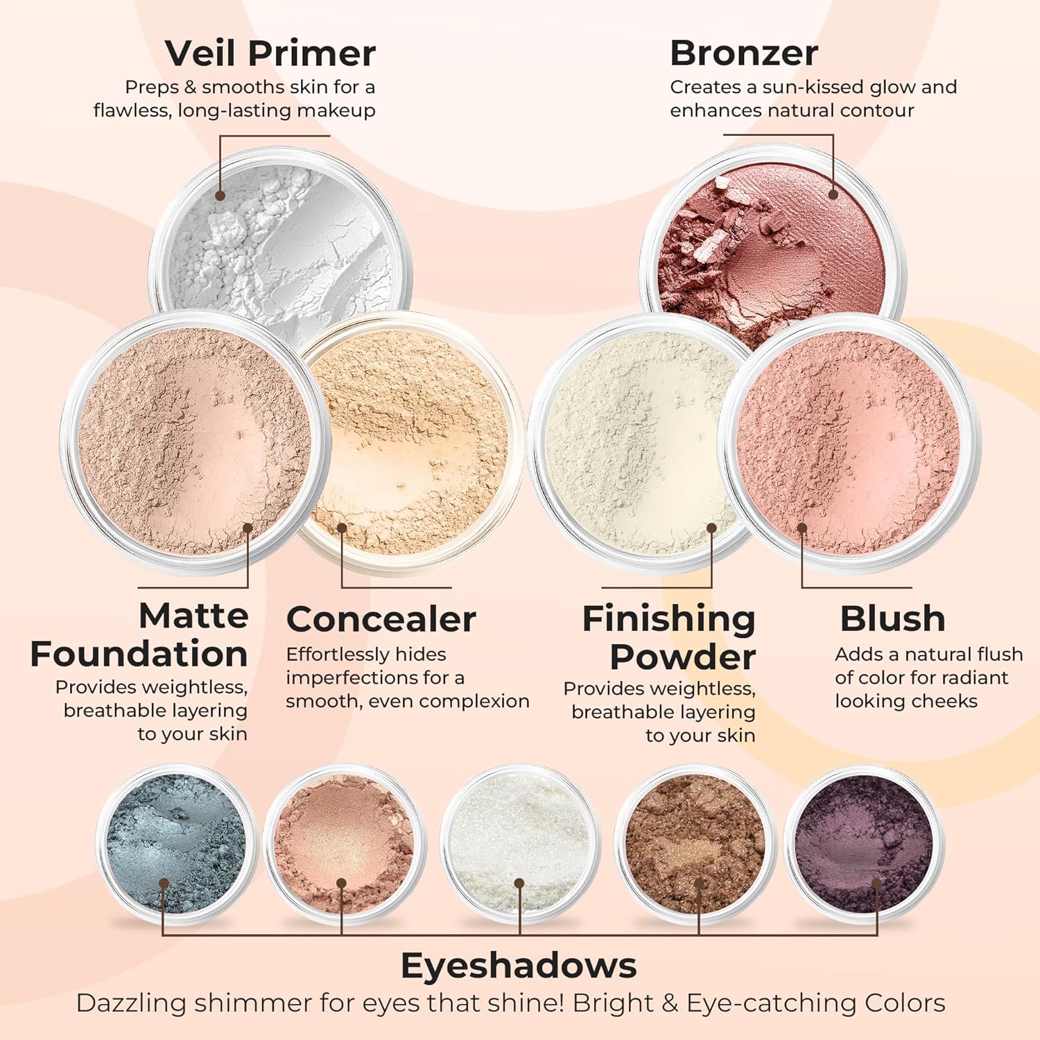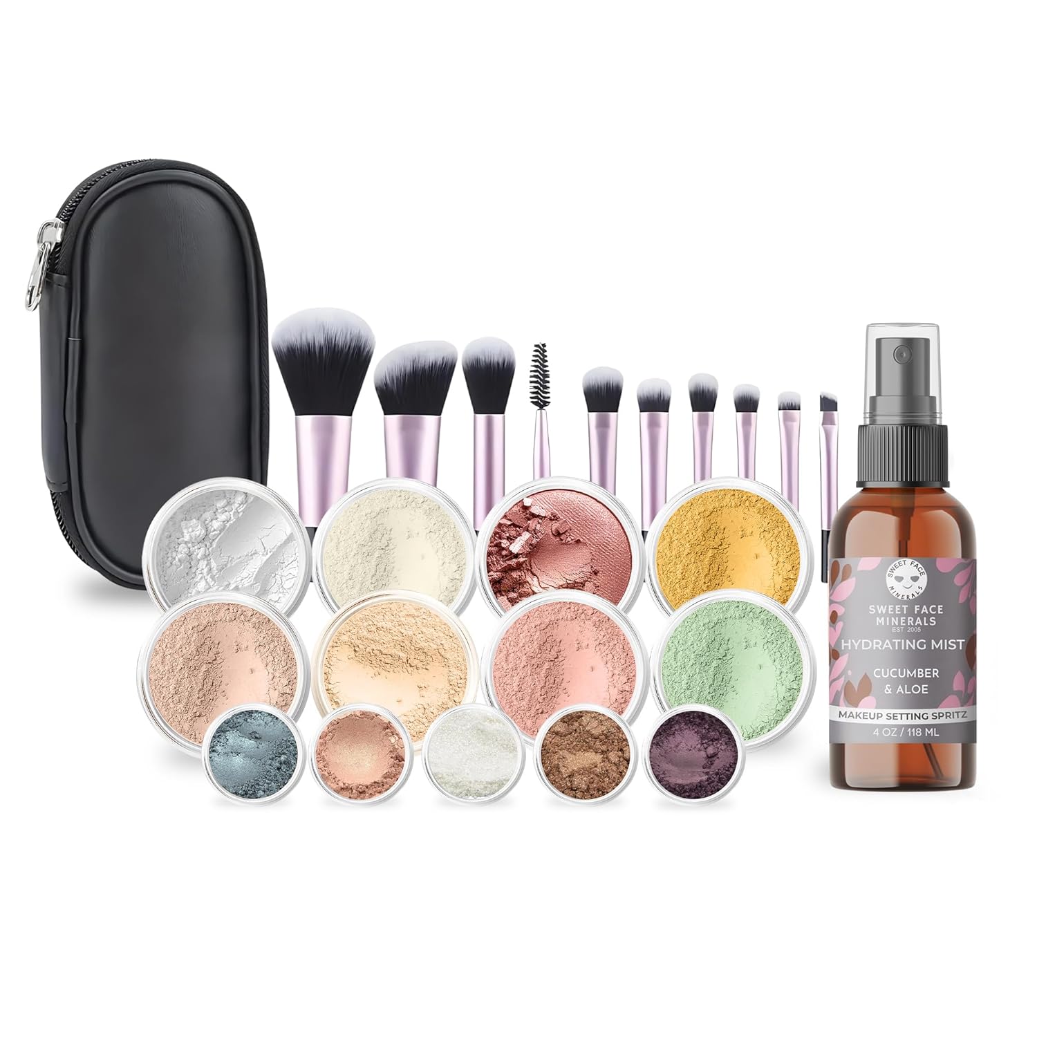 - 【 COMPLETE KIT 】: 20Gm Sifter Jars – Foundation, Concealer, Bronzer powder, Sweet Cheeks Blush, Veil Primer and Finishing Powder. 1 Yellow Corrector + 1 Green Corrector Powder, 5 Shades Eyeshadow Powders, 1 Retractable Makeup Brush, Brush Set with Protective Case, 4 oz Aloe and Cucumber Hydrating Mist and Makeup Setting Spray