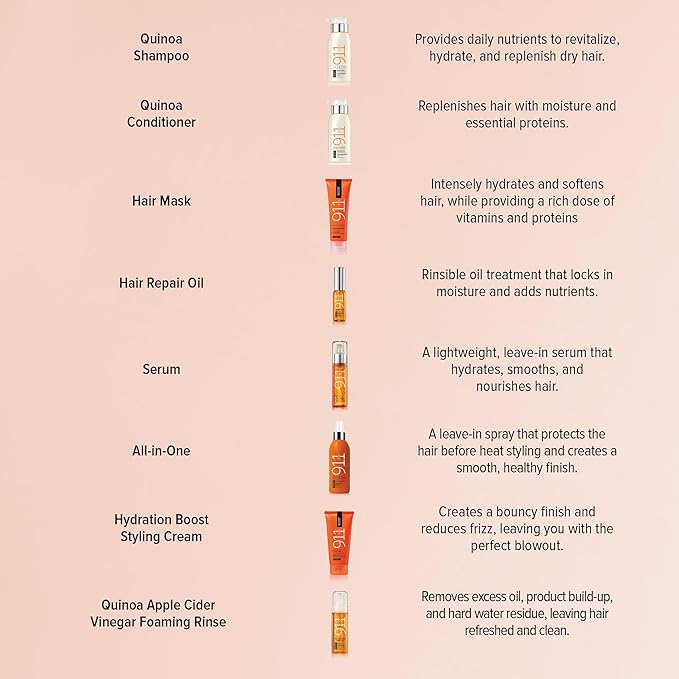 - No Parabens, Sodium Chloride, or SLS/SLES – Our 911 Quinoa hair care products are formulated to provide in-depth hair repair for dry, damaged hair. Our products are made with active ingredients, are always pH balanced for hair & scalp powered by superfood quinoa, keratin, argan oil & more.