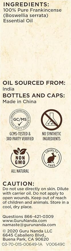 - GuruNanda's Frankincense essential oil is 100% pure & natural. Sourced directly from the farms of India, it is packaged in the USA and boasts an enchanting aroma with no added artificial fragrances.