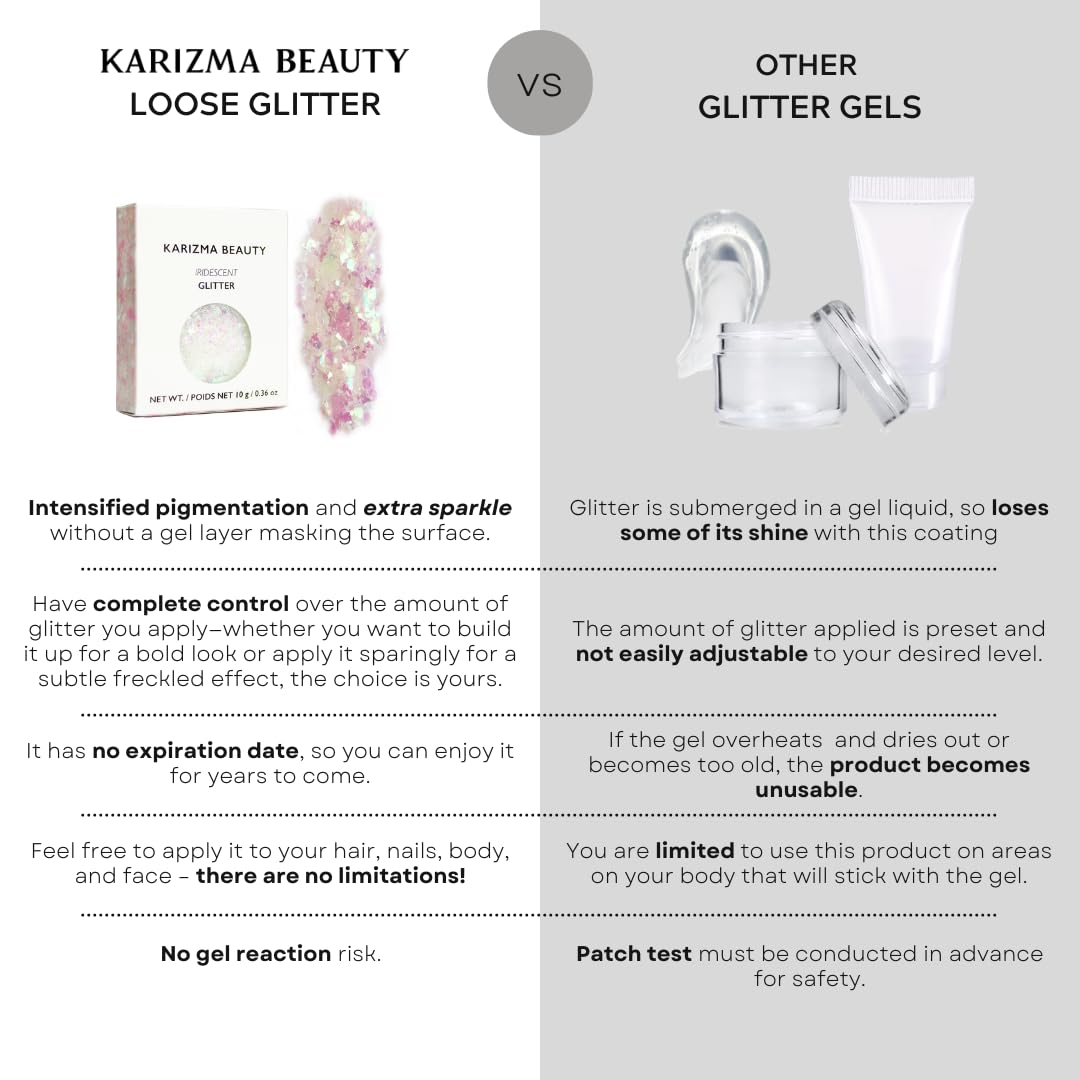 KARIZMA Iridescent Glitter. 10g Chunky Face, Hair, Eye and Body for Women. Rave, Festival Accessories, Cosmetic Makeup. Loose Glitter Set