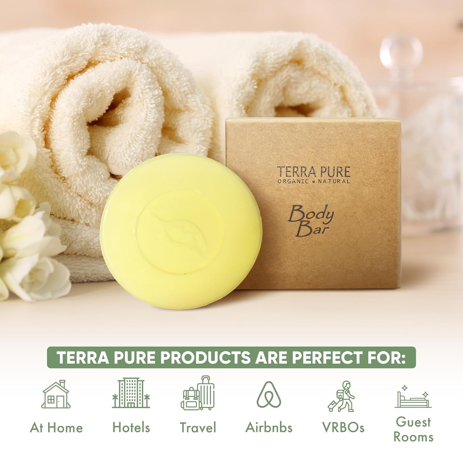 - DIVERSIFIED HOSPITALITY Terra Pure Green Tea Body Bar Soap, ideally designed and packaged for use in Hotel, VACATION RENTAL (AirBnB &VRBO), Motel, Bed and Breakfast, Guest Room, and more to provide GREAT LOOKING hospitality service.