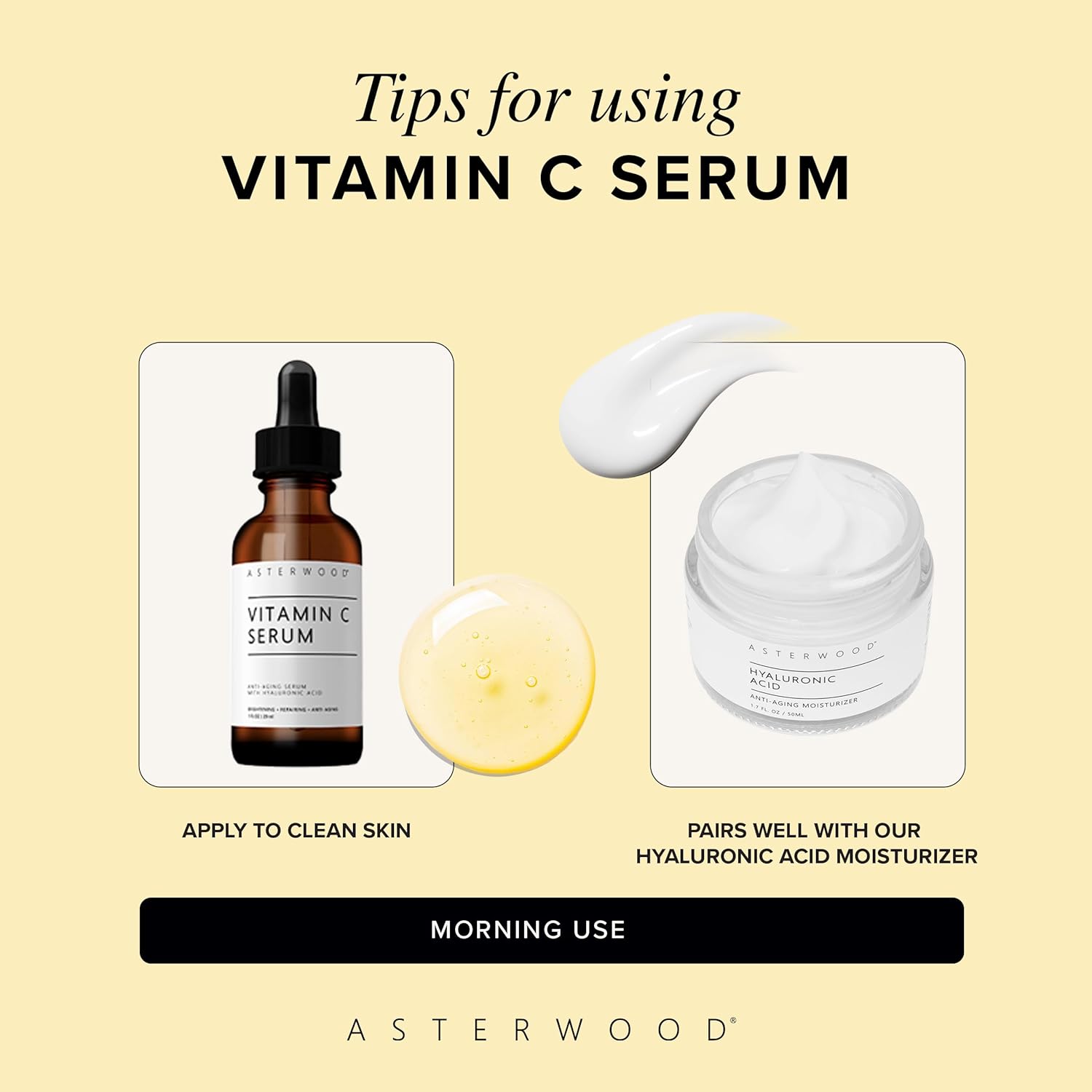 Asterwood Vitamin C Face Serum - with Hyaluronic Acid - Smoothing, Hydrating, Stimulates Collagen Production - Fragrance-Free - 8 Fl Oz