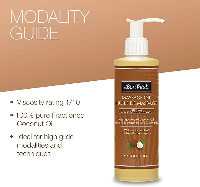 Bon Vital' Coconut Massage Oil with 100% Pure Fractionated Coconut Oil to Repair Dry Skin, Used by Massage Therapists and At-Home Use for Therapeutic Massages and Relaxation, 8 Oz, Label may Vary