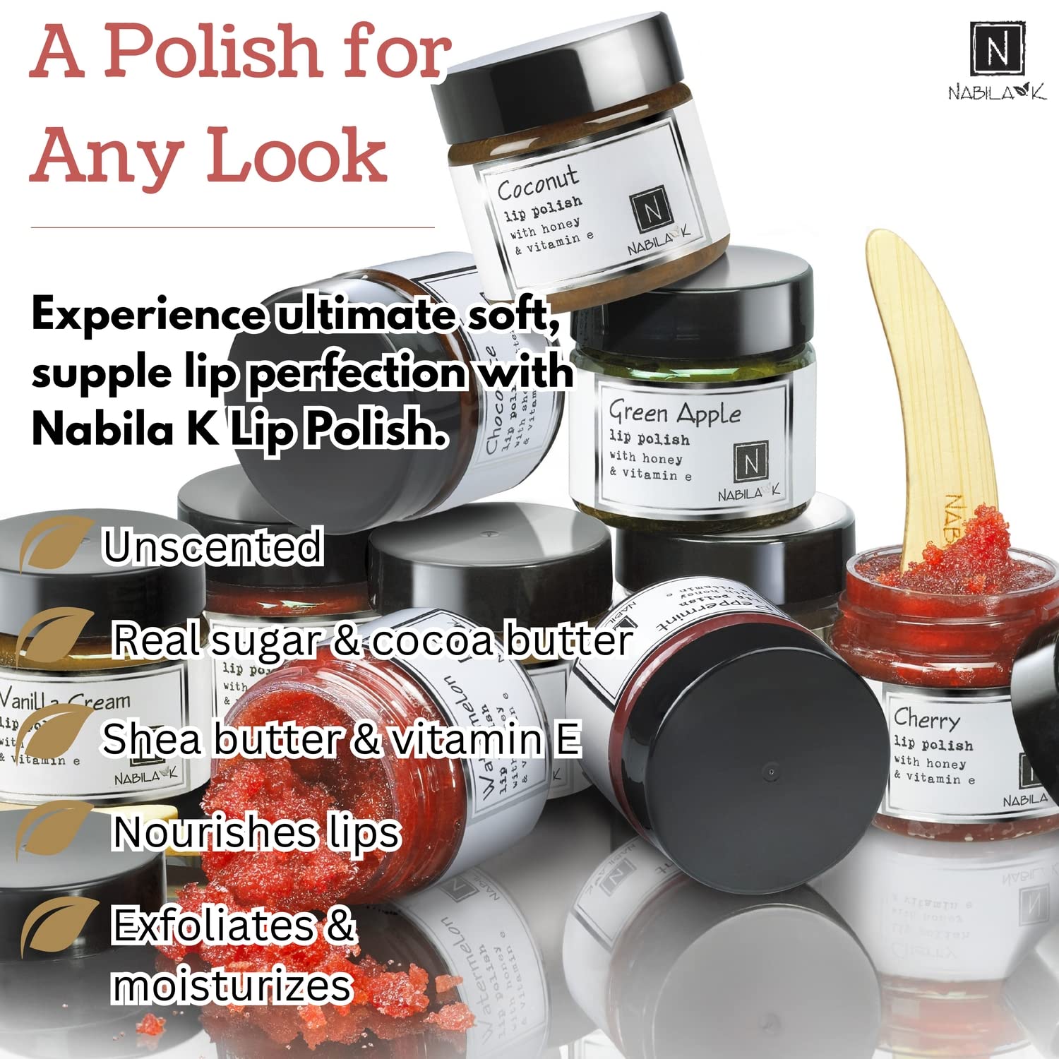 - Massage a pea-sized amount of polish with fingertips onto lips until mostly dissolved. Gently pat off excess lip scrub with a tissue or towel. Use as needed. Follow with Nabila K Lip Balm to lock in lip moisture and avoid chapped, dry lips. When used at least twice a week, the texture and appearance of your lips will drastically improve. This lip polish exfoliator is a must to enhance your natural beauty and healthy glow.