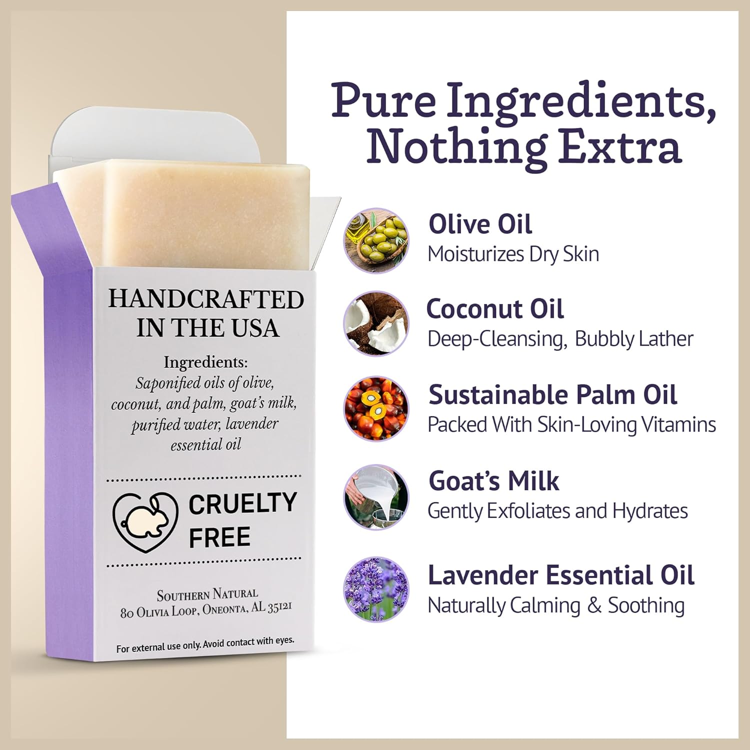 Southern Natural Goat Milk Soap Bar (Lavender 3 Pack) For Dry Sensitive Skin. Natural, Handmade Soap For Men, Women, Kids & Baby. Use On Face & Body