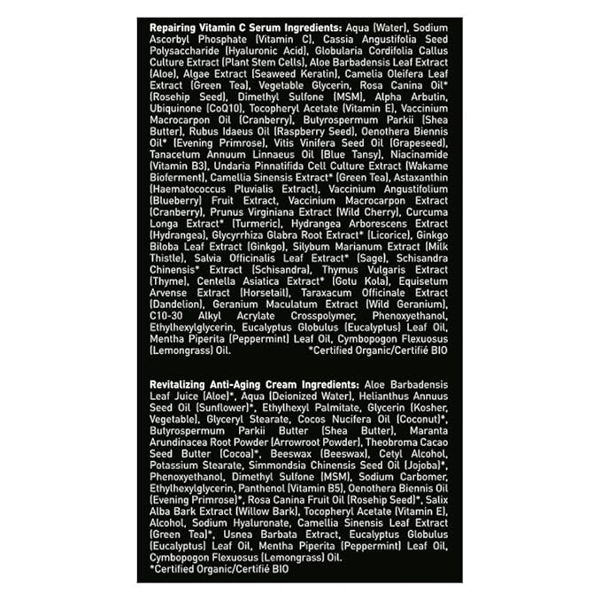 - Key Ingredients: Natural & Certified Organic ingredients, including aloe, DMAE, MSM, Plant Stem Cells, Vitamin C, hyaluronic acid, protein peptides, and caffeine.
