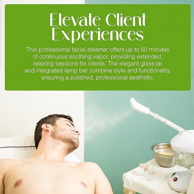 - Bringing Skin Care to the Next Level - Using this professional facial steamer for estheticians, your clients will enjoy up to 60 minutes of soothing vapor. This esthetician facial steamer features a stylish glass jar with a connecting bar for the lamp — a fusion of style and functionality!