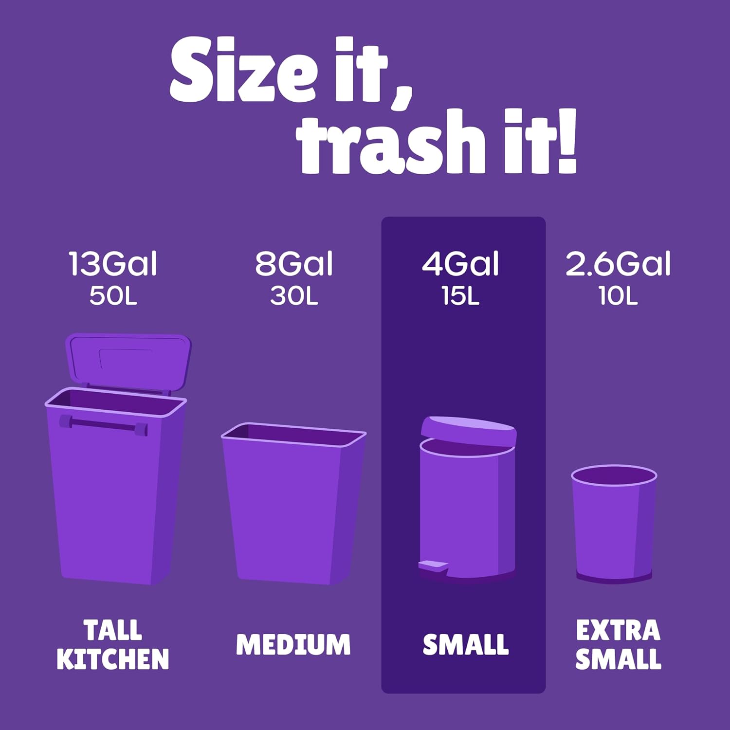 - Dimensions (L*W) - 18 inches * 20inches. 150 counts of 5 rolls 4 gallon trash bags. Thickness: 0.48mil. Fit small size trash bins, round garbage bins with diameter ≤ 12", height ≤ 16", rectangular wastebaskets with longest side ≤ 9" and height ≤ 16".