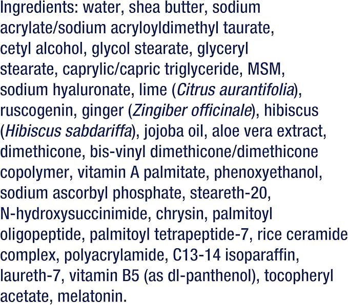 - Lock in youthful moisture – Enhanced with rice bran ceramides, lipid molecules that occur naturally in skin to help retain moisture and inhibit dryness. Shea butter, green tea leaf extract, vitamins and other topical nutrients help nourish your skin.