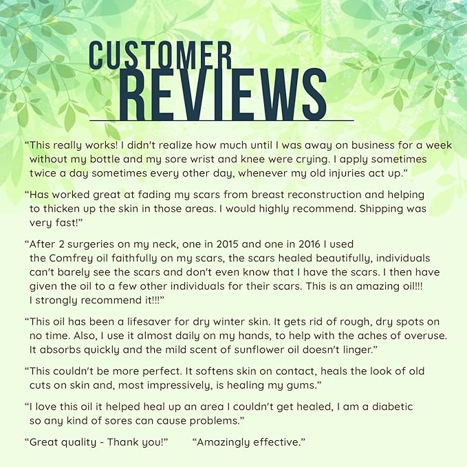 - All our Herbal Oils are crafted in house – Comfrey Oil, Calendula Oil, Chamomile Oil, Chickweed Oil, Raspberry Leaf Oil, Witch Hazel Oil. - We know what goes into our products, and we make sure it is of the highest quality - We are dedicated to bring the best to our customers - We listen to peoples' needs, and we make products that fit their needs. Comfrey leaf oil that makes a great ingredient for any comfrey creams or ointment formulas.