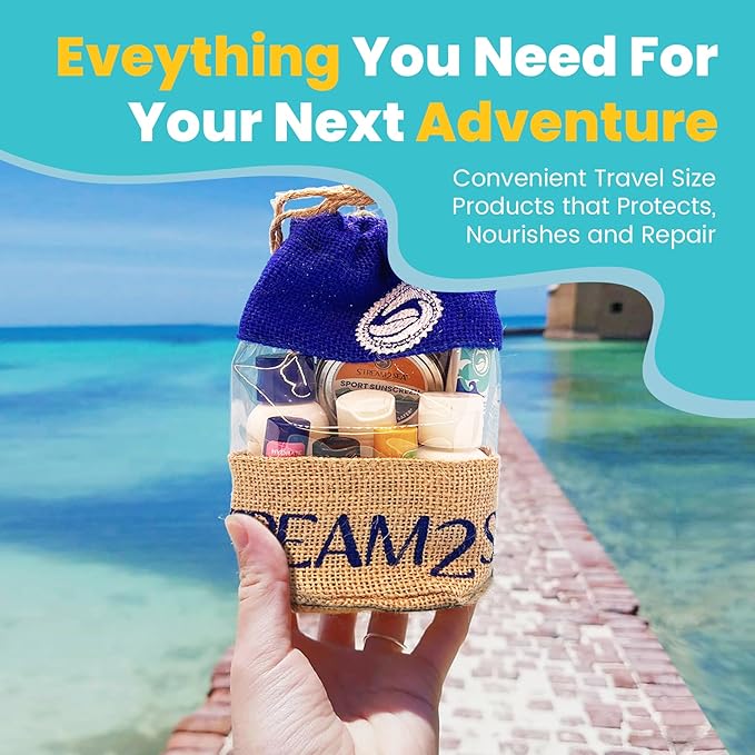 - Reef Safe, Biodegradable Travel Sized Gift Set; Our natural products are safe for use while camping and boating and is perfect for travel. Set Includes 1oz Travel Size Shampoo, Leave In Conditioner, SPF20 Sunscreen, SPF30 Tinted Mineral Sunscreen & Sting Relief Gel