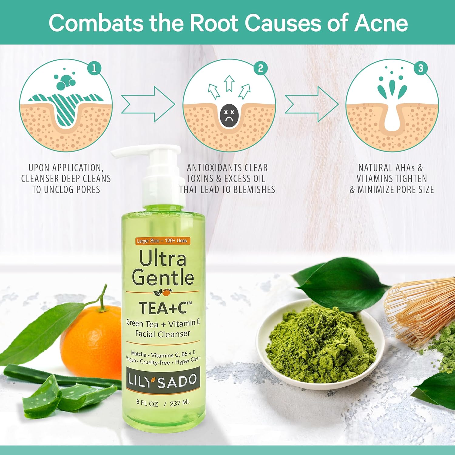 LILY SADO TEA+Cโข Green Tea & Vitamin C Face Cleanser โ Natural Vegan Antioxidant Daily Face Wash with Aloe, Rosehip, Meadowfoam - Gentle Deep Cleansing for Acne, Blackheads, Blemishes. 8 oz