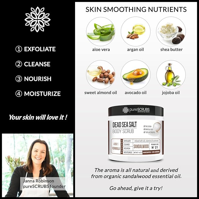 - GET ULTRA SMOOTH SKIN FAST - THIS WORKS! Our unique “4 in 1 Formula” does everything a body scrub should do and more - EXFOLIATE, CLEANSE, NOURISH & MOISTURIZE. Fine grain dead sea salt infused with essential oils, nutrients and skin softeners helps to smooth away rough, bumpy, and uneven textures to instantly reveal your true soft, healthy and radiant skin. You'll love the sandalwood aroma!