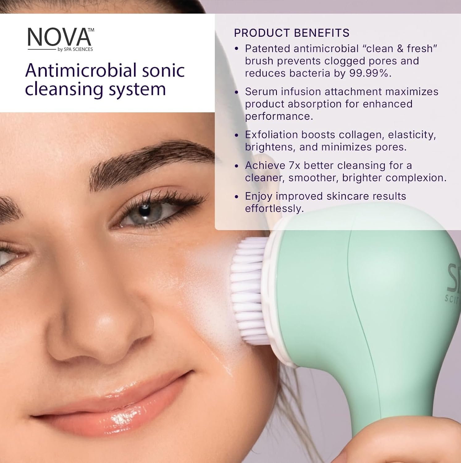 Spa Sciences - NOVA - Sonic Cleansing Brush with Bristles & Infusion System – Anti-Aging Facial Exfoliating, Waterproof, and USB Rechargeable