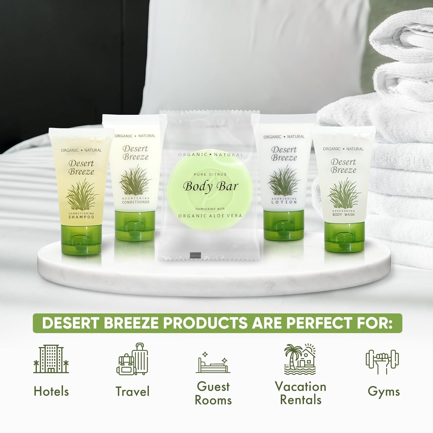 - WHY CHOOSE DESERT BREEZE? Our high-end formula & environmentally-friendly beautiful design bring elegance to any upscale property. These hotel toiletries are paraben-free, gluten-free & made with organic aloe, honey, & olive oil for soft skin & hair!