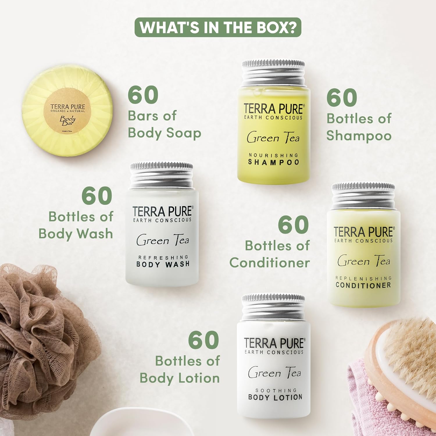 - IN THE BOX: This 300 piece mini toiletries set has everything you need to keep your guests comfortable. Your hotel kit includes 60 of each: Shampoo, Conditioner, Lotion, Body Wash & Soap Bar. Naturally scented with green tea for an invigorating and refreshing scent!