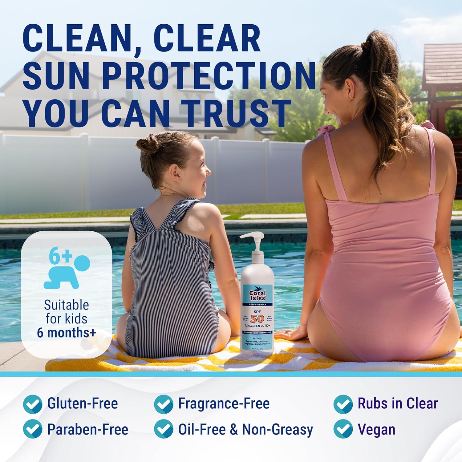 Coral Isles Sunscreen SPF 50 | Hawaii Compliant | Octinoxate & Oxybenzone Free | Broad Spectrum UVA/UVB Protection | Water Resistant 80 Min. | Fragrance Free | 32 Fl Oz Quart w/Pump
