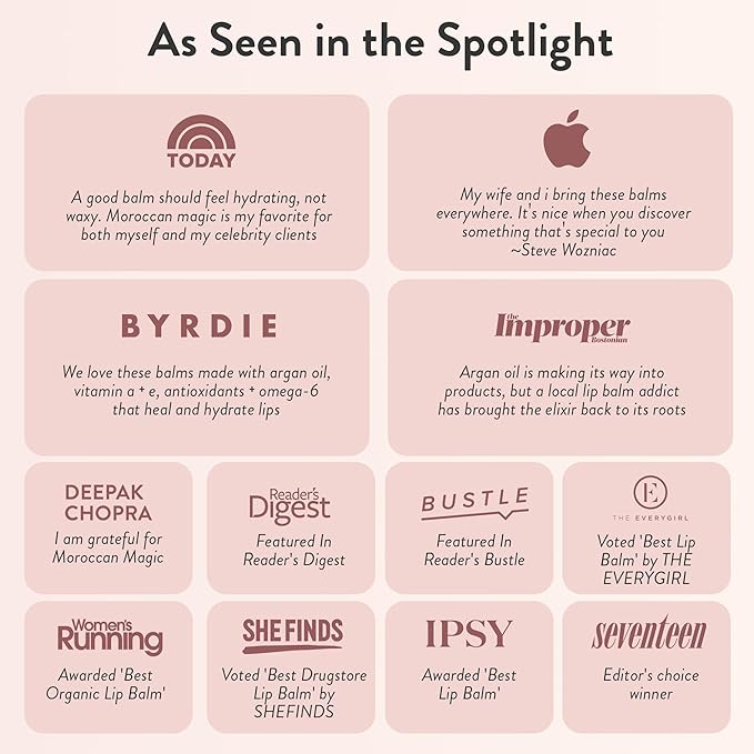 - MOROCCAN MAGIC: As a true lip balm lover, you are most likely (and understandably) very picky about which lip balms you use. That’s good, we are too! That’s why we have created what people are now calling “The Smoothest Lip Balm Ever!” We are proud to offer a better balm, it's as simple as that. You deserve a higher quality everyday lip balm at an everyday price.
