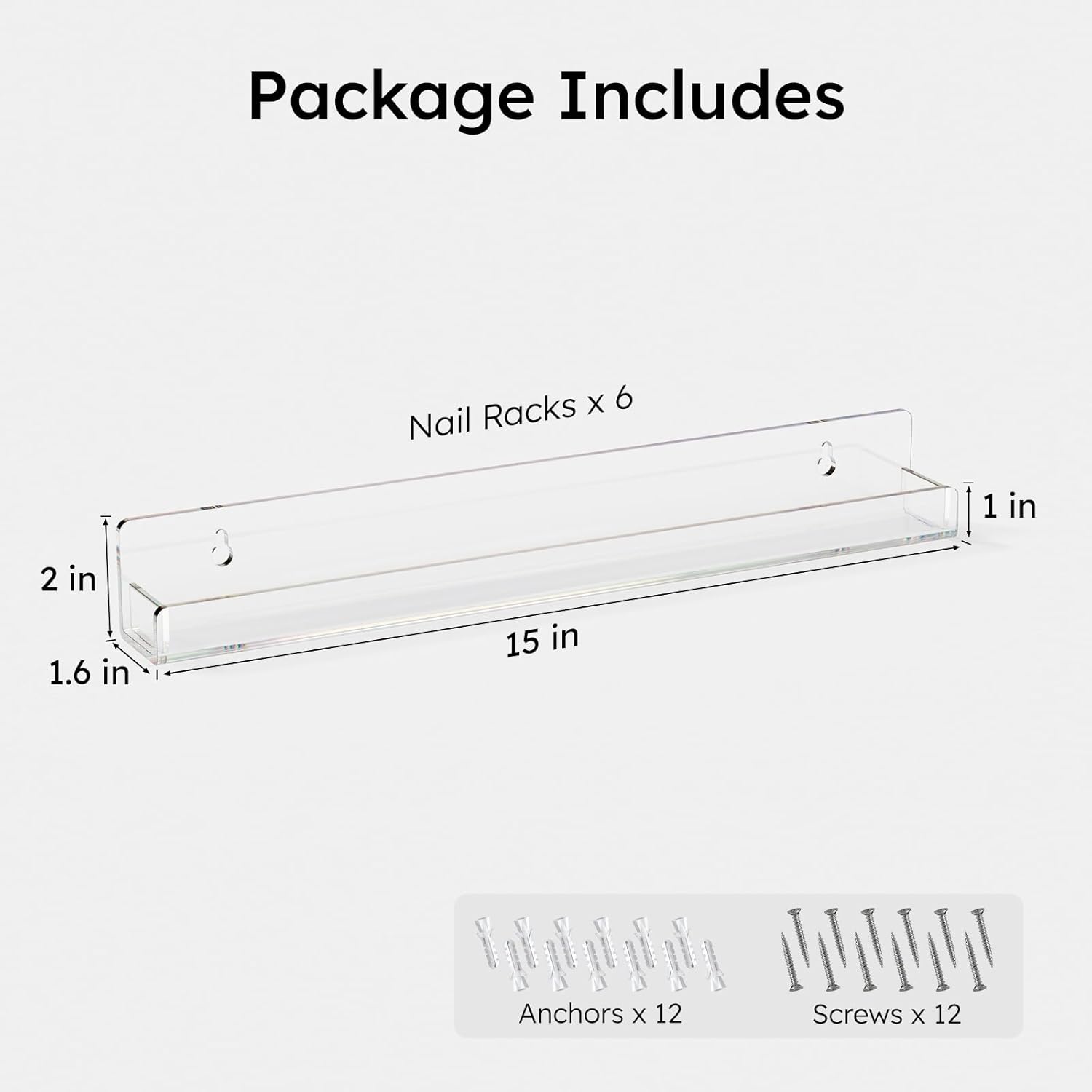 FEMELI Nail Polish Wall Rack: 6 Shelves 15 Inch Clear Acrylic Nail Polish Organizer for 66-90 Bottles Multi-Purpose Acrylic Floating Shelves (15 Inch, Clear)