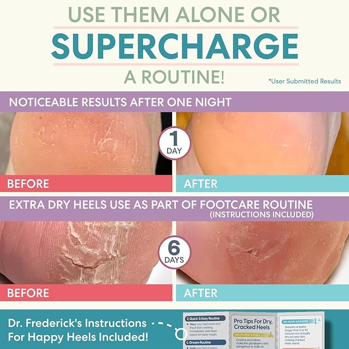 - Fast Cracked Heel Repair: Dr. Frederick’s Original Moisturizing Heel Socks are expertly developed to offer a soothing experience, hydrating heels in as little as 7 days. Reduce irritation and encourage healthy skin with our comfy, breathable, toeless heel socks. Plus, with our crack-free guarantee, you can purchase with confidence, knowing you’re getting the best moisturizing gel heel socks for dry cracked feet.
