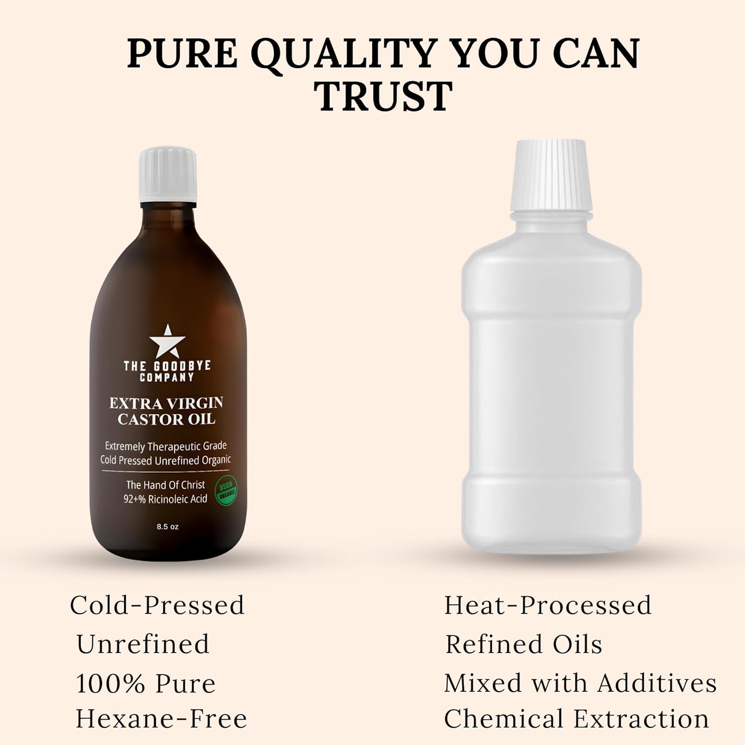 The Goodbye Company Organic Cold-Pressed Castor Oil - 8.5 oz Glass Bottle, Hexane-Free, Extra Virgin, Small Batch Family Farm Ethically Sourced for Hair Growth, Skin Care, Lashes, Brows & Castor Oil