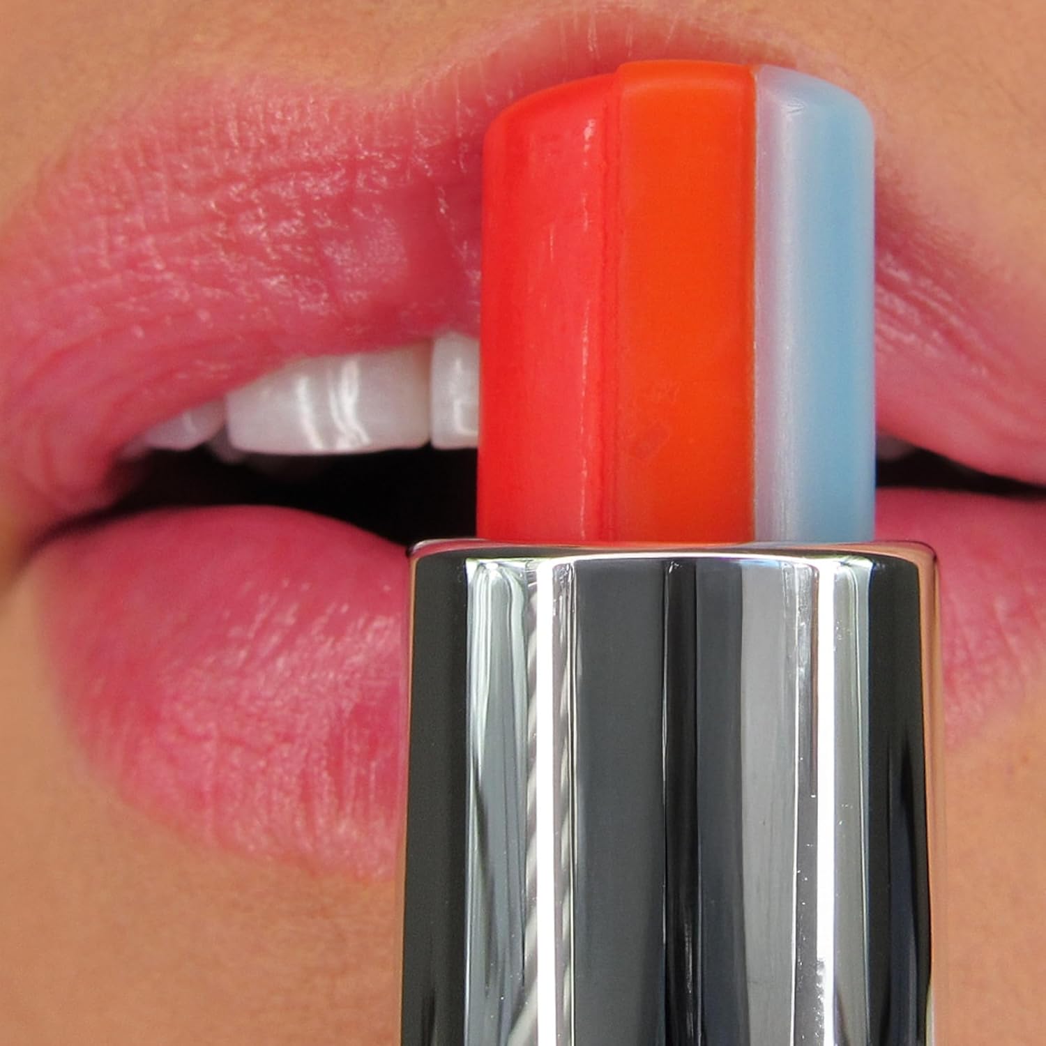 - Product Benefits : Features red and orange stripes that are tinted, while the blue stripe reacts to your lips' natural pH levels for a cherry pink color. Features red and orange stripes that are tinted, while the blue stripe reacts to your lips' natural pH levels for a cherry pink color.