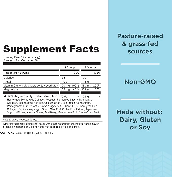 - NEW LOOK, NEW FORMULA - You asked, we listened! Multi Collagen Protein Beauty + Sleep has been reformulated with the 5 types of collagen you love, and the benefits you expect in a delicious Vanilla Chai Flavor!