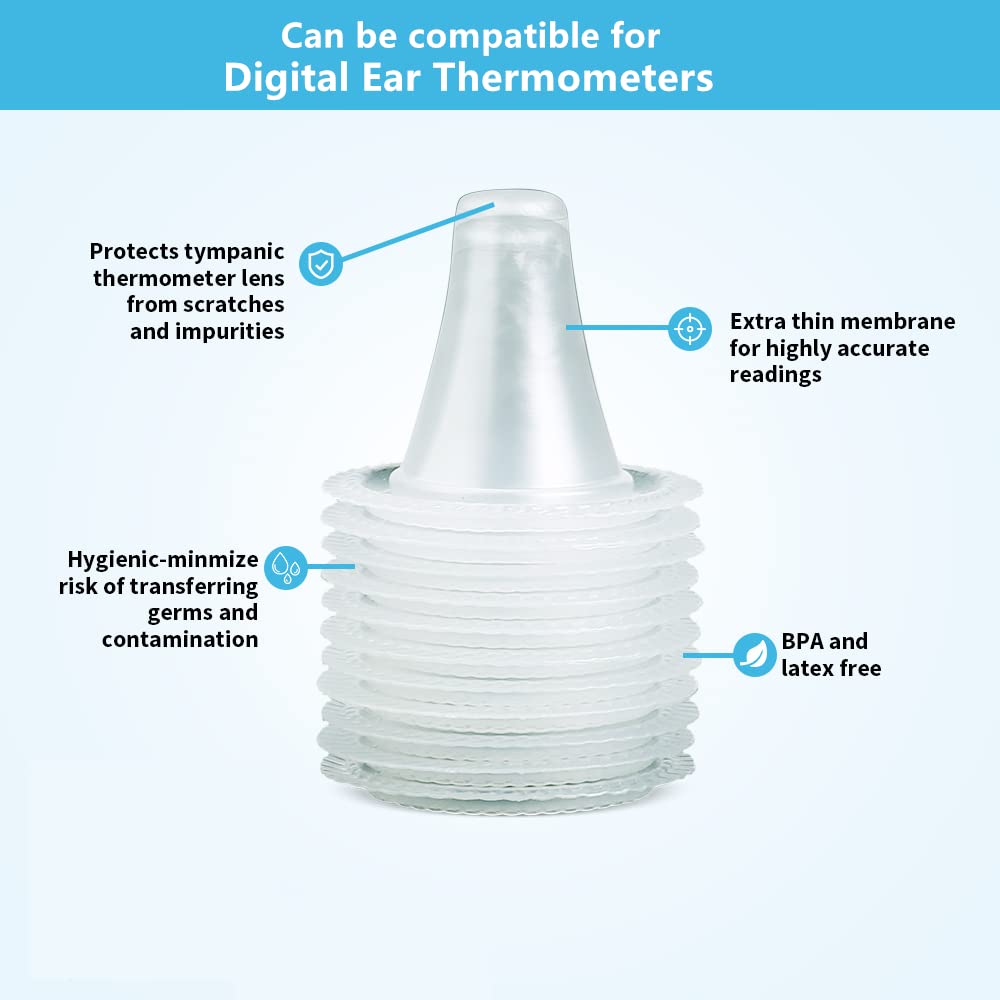 - Great Material: The ear thermometer probe covers are disposable and recyclable, 0% BPA and 0% latex.You can feel safe to use our probe covers. Our ear thermometer covers are the best choice for using in preschool, daycare, clinic, at-home medicine.