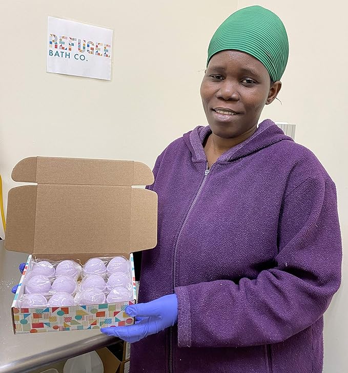 - REFUGEE MADE: Every box contains a "thank you card" explaining more about the individual who made your bath bombs. Each bath bomb is proudly hand-made in Washington State by refugees in our community. Our primary mission is to celebrate and welcome refugees in our community by providing employment.
