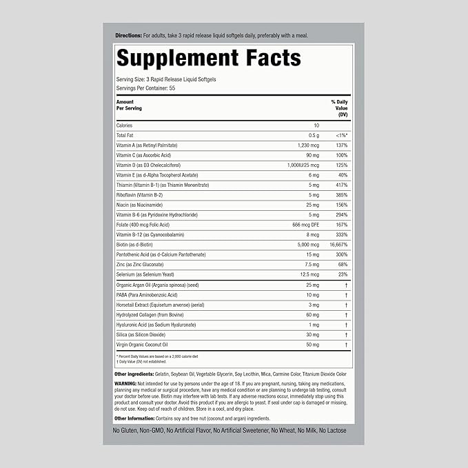 Piping Rock Hair Skin and Nails Vitamins | 165 Softgels | 5000 mcg of Biotin Extra Strength | with Argan and Coconut Oil | Non-GMO, Gluten Free Supplement