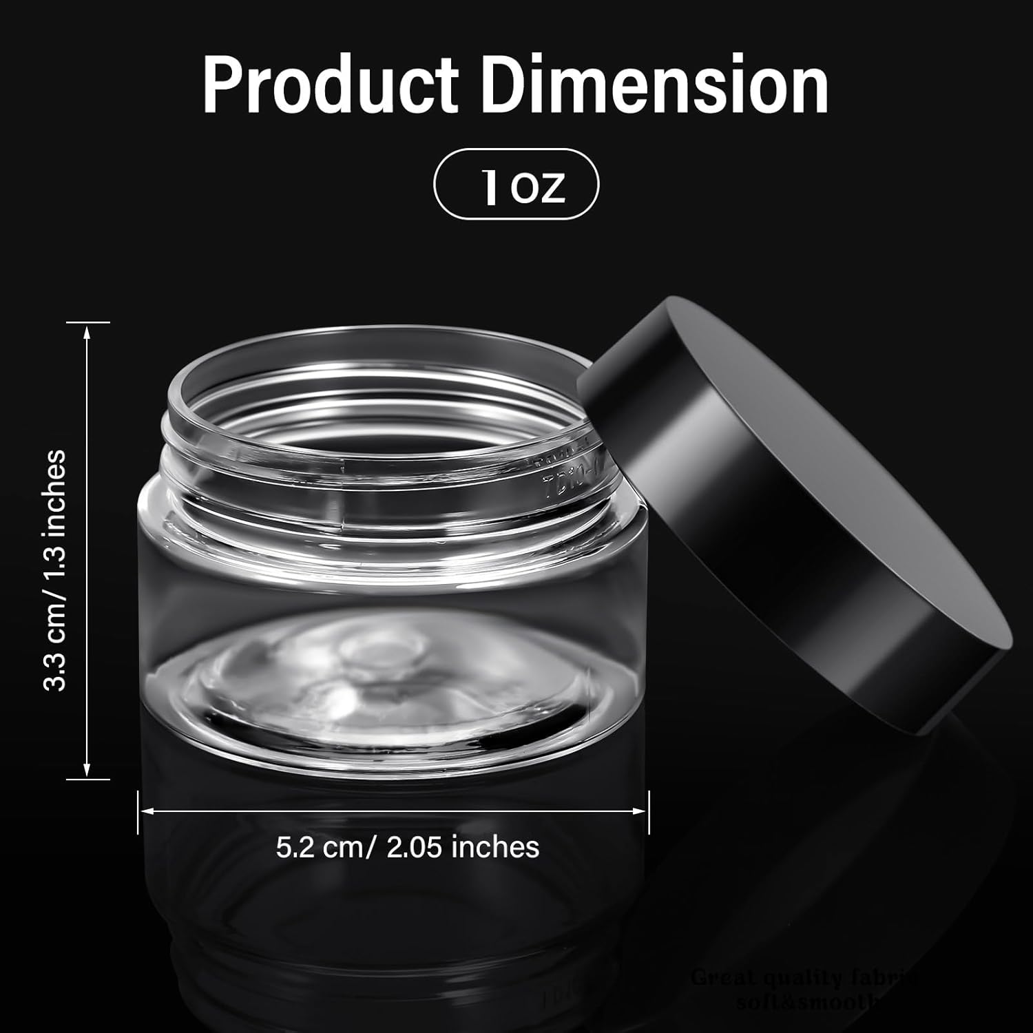 - Package: includes 12 packs 1 oz clear plastic jars with black screw-on lids; They are durable and refillable, measuring 5.2 cm/ 2.05 inches in diameter, 3.3 cm/ 1.3 inches in height