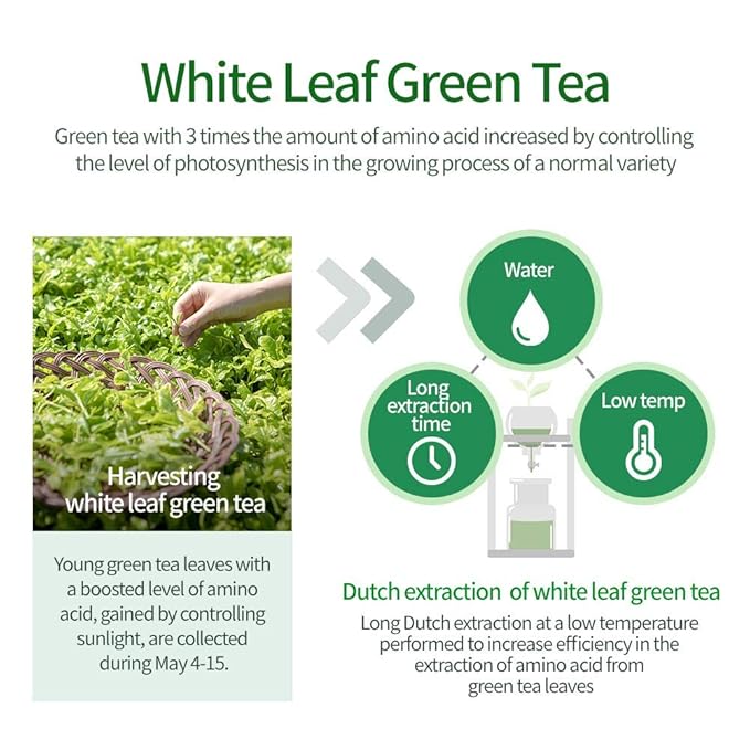 - WHITE LEAF GREEN TEA (also known as white matcha), which features 3 times the amount of amino acid than normal varieties, that also helps you to provide hair with moisture and strength, as well as preventing baldness and hair-loss, boosting your confidence in style