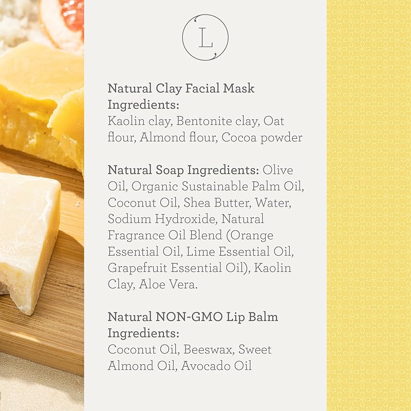 - SPA DAY KIT FOR WOMEN: Our citrus bath set includes a grapefruit soap bar, a Ylang Ylang soap bar, body scrub, body oil, shea butter, bath salts, a bath bomb, a candle, a shower steamer, a clay mask, lip balm, a towel, an eye mask, a sponge, and a makeup bag.