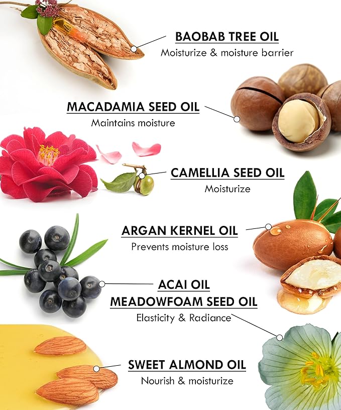 - ✅ 7 FACIAL OIL BLENDS. Infused with baobab tree, macadamia seed, camellia seed, argan kernel, Asian palm fruit, meadowfoam, and sweet almond oils, this face cleansing oil fortifies the skin moisture barrier to enhance its moisture retention ability and provides optimal hydration.