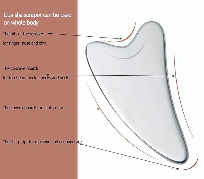 - ๐ Multipurpose gua sha scraper: The gua sha scraper is used for facial massage, which can be used on the whole body, help absorb skincare products like serums, oils, lotions, and moisturizers into cells for lifting and tighten the face, relieving sniff neck and frozen back, making it your face look slimmer by shrinking swollen facial tissues and pores