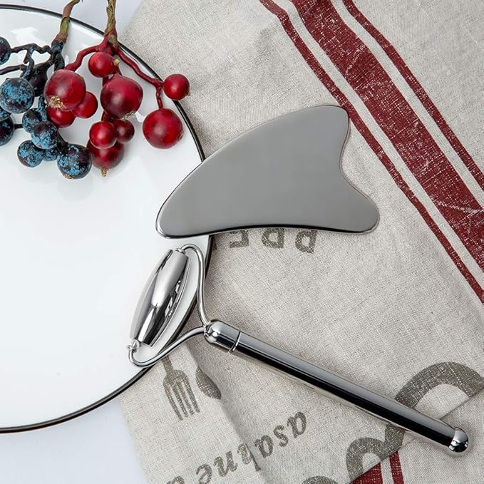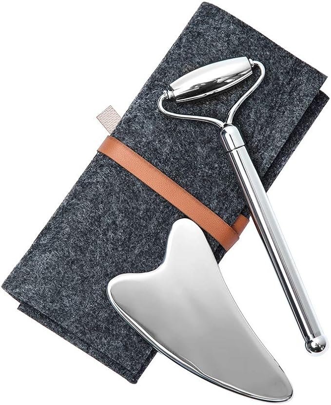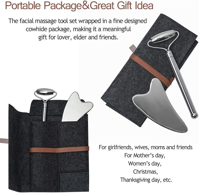 - ๐ Sturdy&safe stainless steel material: Made of premium top quality stainless steel material, the facial massage tools set is perfect for doing facial SPA. The material itself says for durability and easy cleanup. The smooth edges and curves of the roller and scraper ensure gently touching your skin without hurting while massaging your face accurately