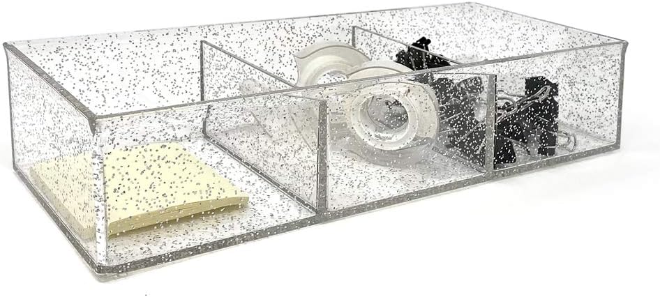 - HIGH QUALITY: This stylish 3-compartment organizer is built with durable Lucite material. This tray is designed to be stackable to save you even more space. Your daily necessities will stay visible in this clear organizer, so you can always grab items when you are on the go. Its shine can be maintained by wiping with a cloth or paper towel. [Note: Do not use window cleaner on acrylic] [Overall Dimensions: 12.9" L x 5" W x 2.7" H] [Individual Sections: 4.1” L x 4.6” W x 2.6” H]