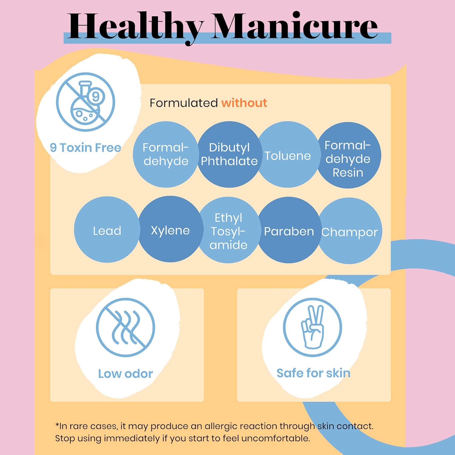 - 【Environmental & Healthy】: 9 Toxin Free Ingredient makes it healthy and low odor. No harsh ingredients or adhesives that lead to damaged nails.