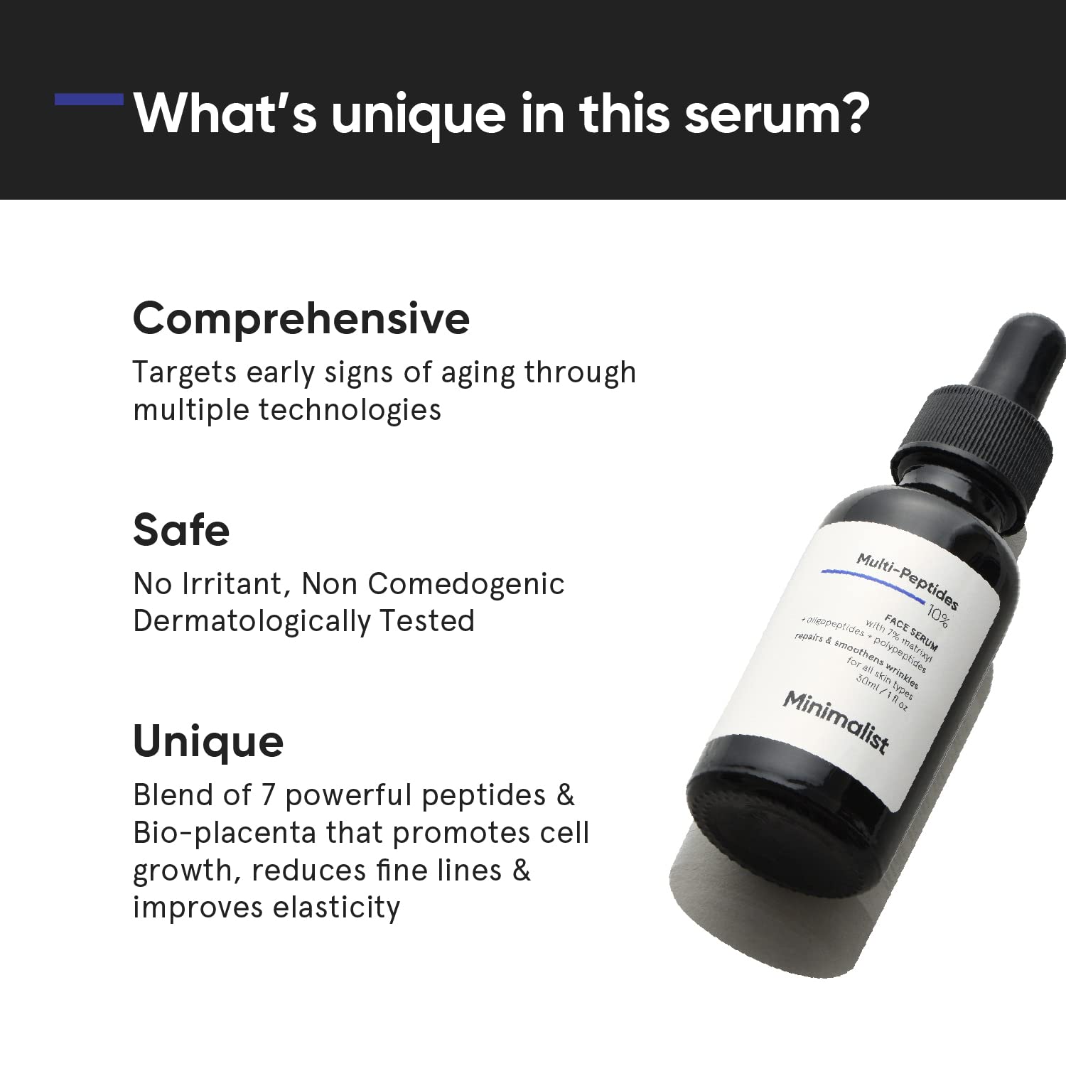 - [ BOOSTS COLLAGEN ]: The Minimalist Multi-peptide serum contains Bio-placenta, obtained from microbial fermentation, which helps in synthesizing various growth factors (very similar to human Placenta). The combination of five growth factors and other essential factors in Bio-placenta can have synergistic effects on the skin and helps in skin rejuvenation and cell revitalization. It also stimulates cell growth and promotes biosynthesis of collagen.