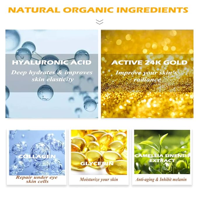 - ♥IMPROVE YOUR SKIN'S RADIANCE - The under eye patch with active 24k gold ingredients flushes out harmful toxins, increases blood circulation, reduces wrinkles and brightens your under eye skin.