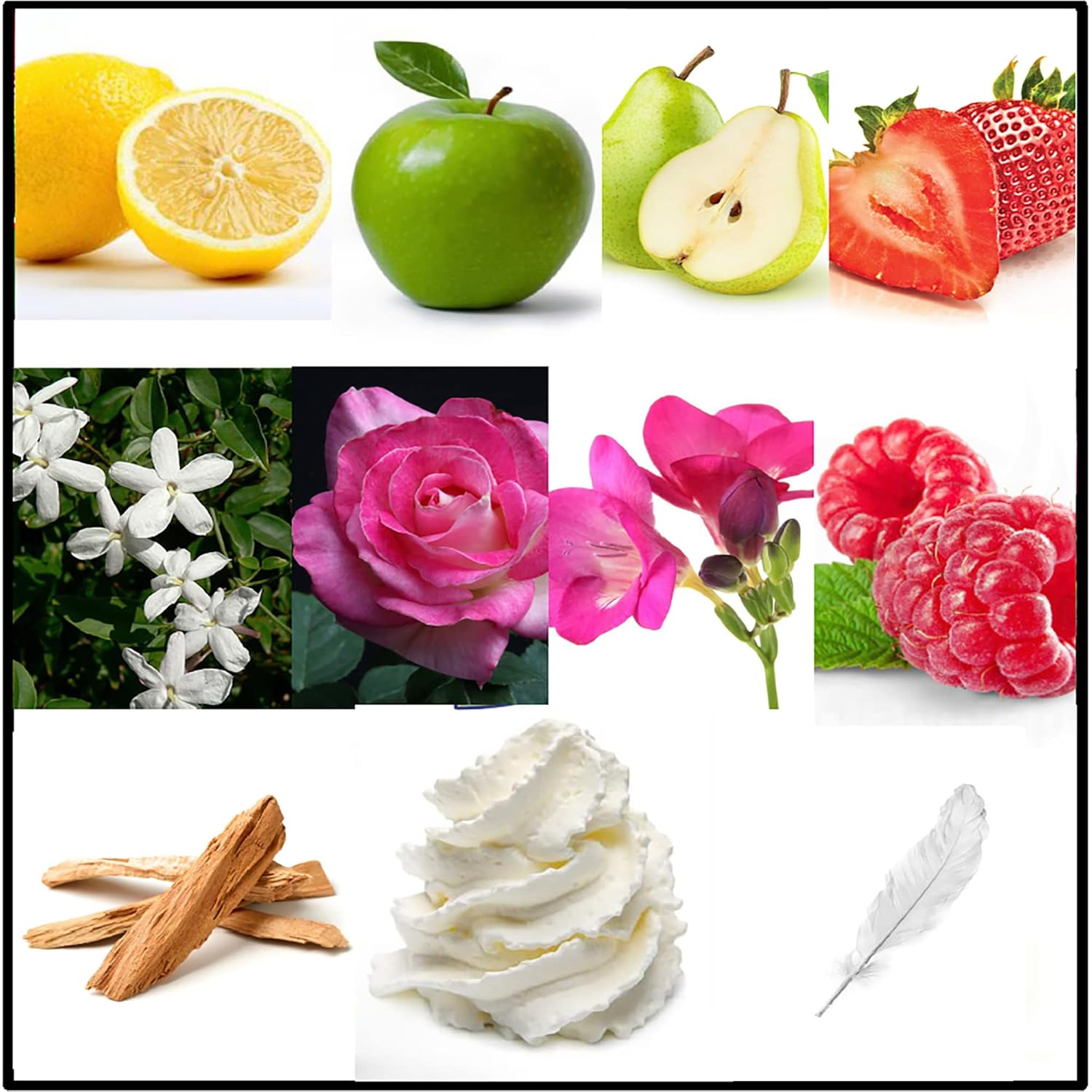 - A LIGHT, SWEET SPLASH OF FRAGRANCE. FRESH arrives with a burst of fruits and citruses, with a concentrated blend of Apple, Lemon, Pear, and Strawberry, easing to a heart of Freesia and Rose, and drying to a base of Sandalwood and Whipped Vanilla.