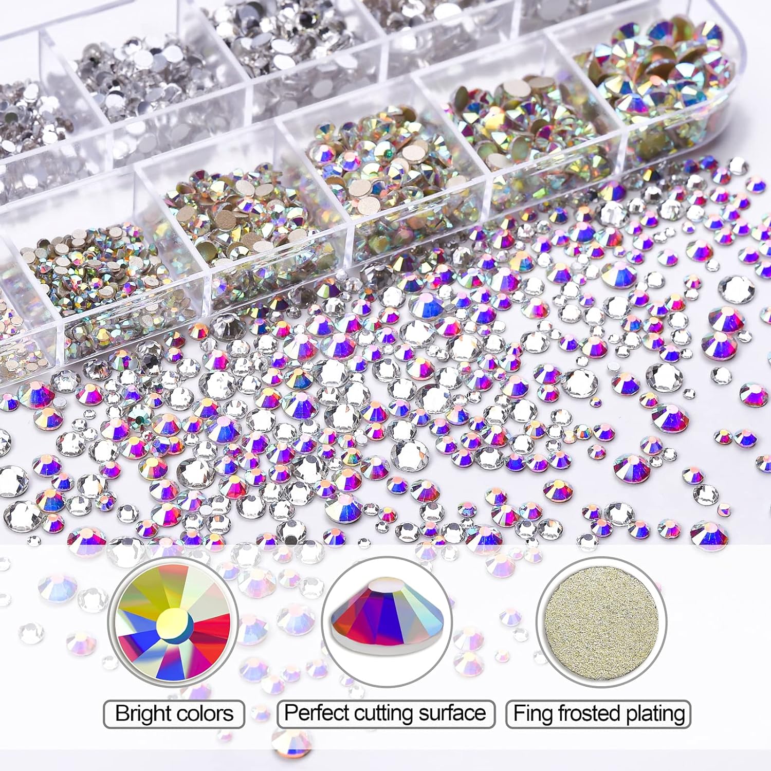 - 【Package Includes】: 1 box of crystals of AB color crystal and transparent color in the quantity of about 2400 pcs; 6 sizes 1.5mm, 2.0mm, 2.7mm, 3.2mm, 3.8mm, 4.8mm; 1 piece of Wax Pencil and 1 elbow tweezer are also included